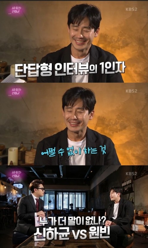 신하균은 최근에는 넉살이 많이 는 모습을 보여주었는데, 질문에 대한 답변도 길어지고 능글맞게 MC와 동료들에게 가벼운 농담을 건네는 모습을 보이고 있습니다. 신하균은 MC의 의도를 의식하지 않는 솔직한 답변으로 본인만의 담백한 매력을 보여주고 있습니다.