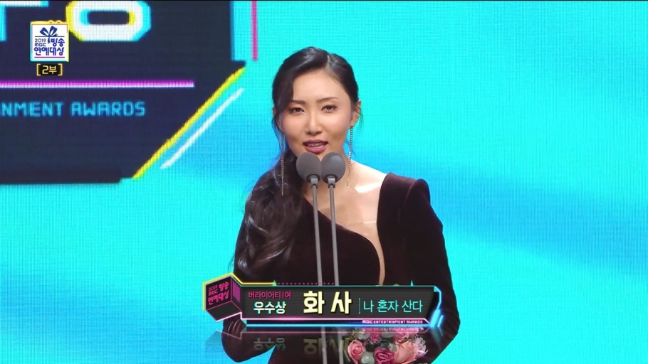 화사는 음악뿐 아니라 예능 활동을 보여주었고 <건반 위의 하이에나>를 통해 2018년 KBS 연예대상에서 '핫이슈 예능인상'을 수상했고, <나 혼자 산다>를 통해 MBC 방송연예대상에서 '버라이어티 부문 여자 신인상'을 수상합니다.