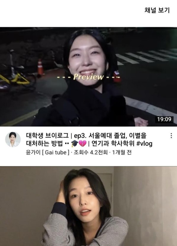 윤가이는 본인의 유튜브 채널에 일상을 담은 브이로그와 연기 독백 영상 등을 자주 업로드하고 있습니다. 윤가이는 서울예술대학교 재학 시절 첫 영상으로 학교 생활을 담은 브이로그를 업로드했습니다. 윤가이는 본인의 이름을 알리기 위해 유튜브를 시작했다고 밝혔습니다.